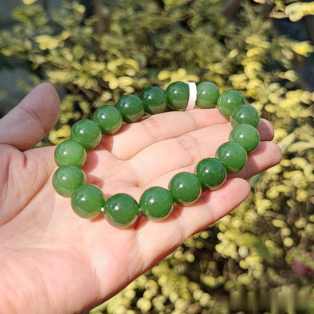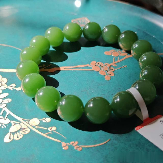 纯正七号坑的老矿料【俄碧】,高度玉化,细糯起胶。高品|珠宝级的碧玉手串,高色浓艳翠绿,脂份十足,远看一汪碧水发光起莹,真是好碧如翠,也太好看了。